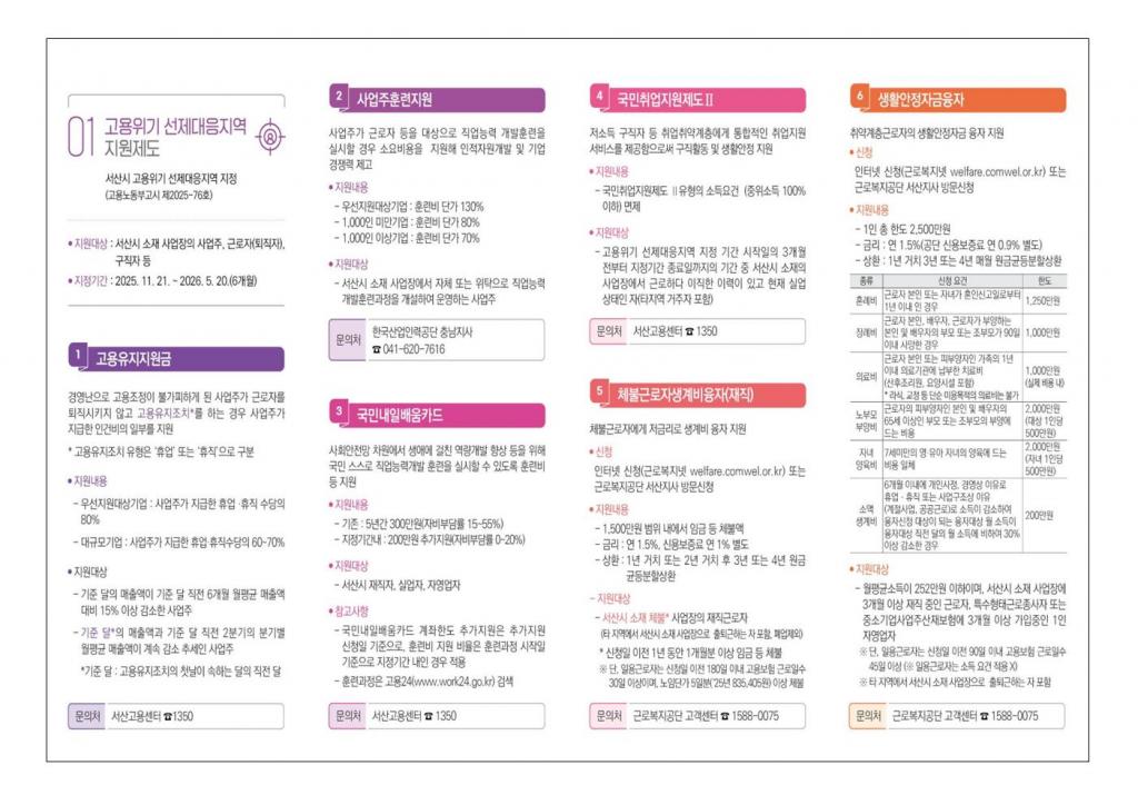 ○ 고용위기 선제대응지역 지원사업 홍보 ● 지원대상 : 서산시 소재 사업장의 사업주, 근로자(퇴직자), 구직자 등 ● 지정기간 : 2025.11.21 ~ 2026.05.20(6개월) |